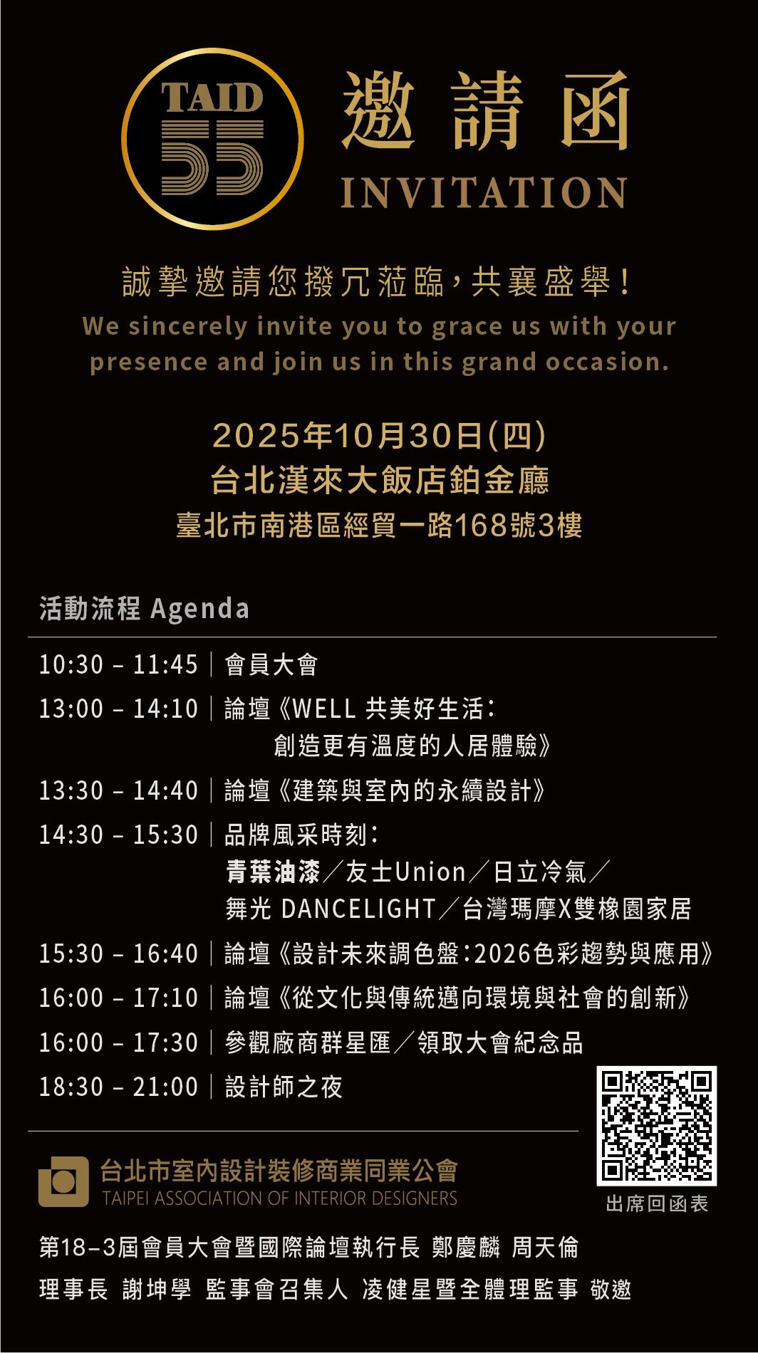 114/10/30本會很榮幸受邀參加由 台北市室內設計裝修商業同業公會(TAID) 主辦的創會55週年慶典暨國際論壇,現場設計產業菁英齊聚一堂,共同見證台北室裝公會在 理事長謝坤學 帶領下,推動室內設計專業與國際接軌的卓越成果。