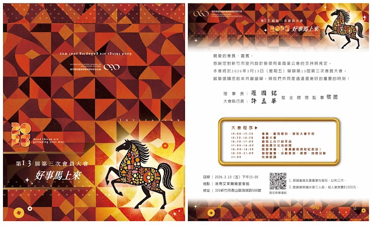2026-03-15 第十三屆第3次會員大會報名 親愛的會員及廠商會員們~ 115 / 3/13(五)將舉辦第十三屆第3次會員大會 地點:新竹市港南艾茉爾婚宴會館 隆重登場,誠摯邀請各位會員們齊聚一堂、共襄盛舉、同歡交流! 尚未填寫報名的會員夥伴們,要趕快喔~ 為了統計餐點與安排座位,請務必於 1/31(日)前 完成填寫(逾期系統將關閉)。 您的出席是對本會最大的支持與鼓勵! 1、會員大會報名連結(1/31截止)https://docs.google.com/....../1FAIpQLS....../viewform...... 2、114年度會員子女獎學金申請書 (請依公告或向秘書處索取) 3、公會入會申請單 https://docs.google.com/....../1FAIpQLS....../viewform...... 也歡迎尚未加入的 室內設計裝修 同業先進、廠商夥伴們,加入我們的行列! 一起交流合作、資源共享、共創更好的產業環境,讓我們越來越強大 回上一頁